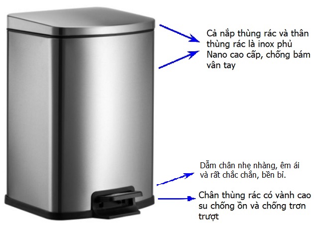 Thùng rác inox đạp chân vuông có chân đạp chắc chắn, nắp xuống chậm từ từ, rất êm