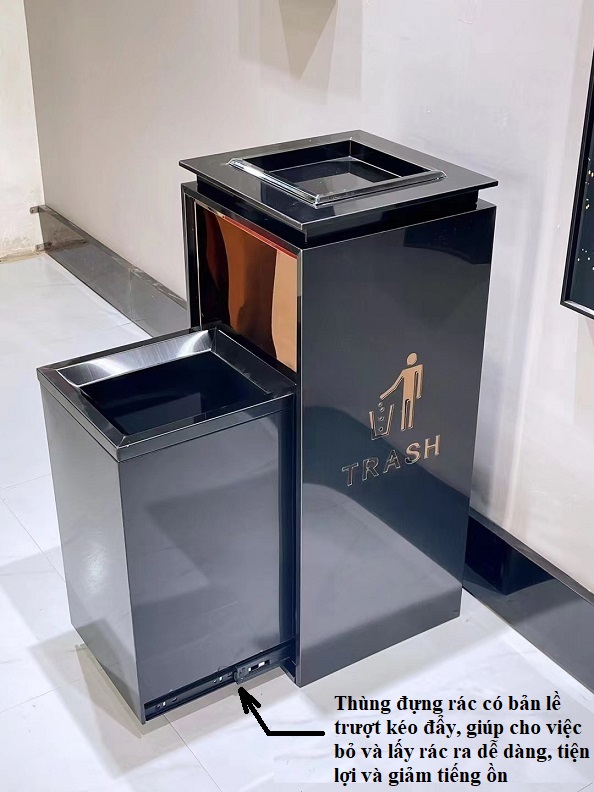 Thùng đựng rác inox có bản lề trượt kéo đẩy, giúp cho việc bỏ và lấy rác ra dễ dàng, tiện lợi và giảm tiếng ồn