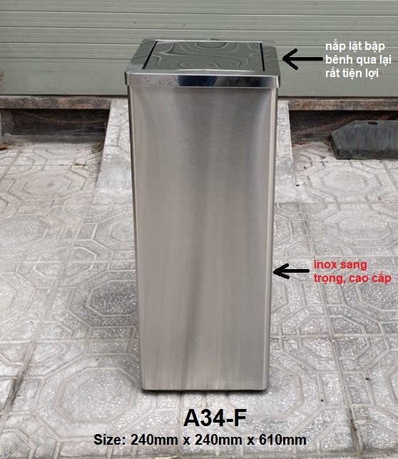 Hình chụp thực tế thùng rác inox vuông nắp lật A34-F